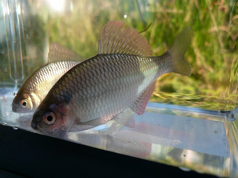 今度も引っ張られて上がってきたのは、背ビレ尻ビレが朱色の雄ヤリタナゴ。