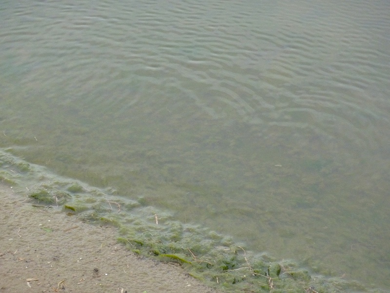 水際には青く茂った水生藻がかなりの厚みで覆っている。